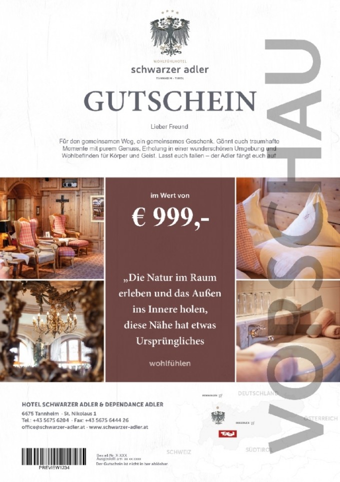 Für den gemeinsamen Weg, ein gemeinsames Geschenk. Gönnt euch traumhafte Momente mit purem Genuss, Erholung in einer wunderschönen Umgebung und Wohlbefinden für Körper und Geist. Lasst euch fallen – der Adler fängt euch auf